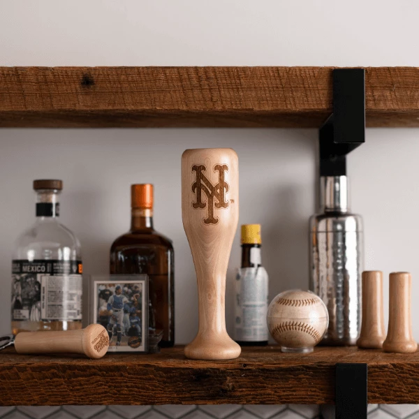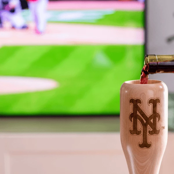 The New York Mets “NY” Wined Up- a mini baseball bat wine glass. This 100% birch wood mini baseball bat is perfect to sip from on the patio, sitting poolside, while watching the “big game”, or even tailgating.