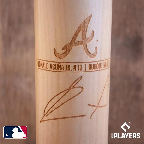 Dugout Mugs® proudly presents the Ronald Acuna Jr. Signature Series Dugout Mug®, complete with Acuna® Jr.’s signature and the Atlanta Braves ‘A’ engraved directly onto this baseball bat mug!